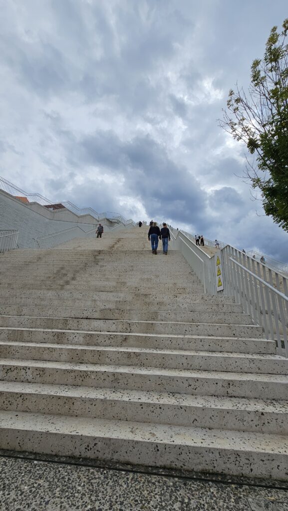 Wir steigen die Stufen hinauf und blicken über die Dächer von Tirana.
