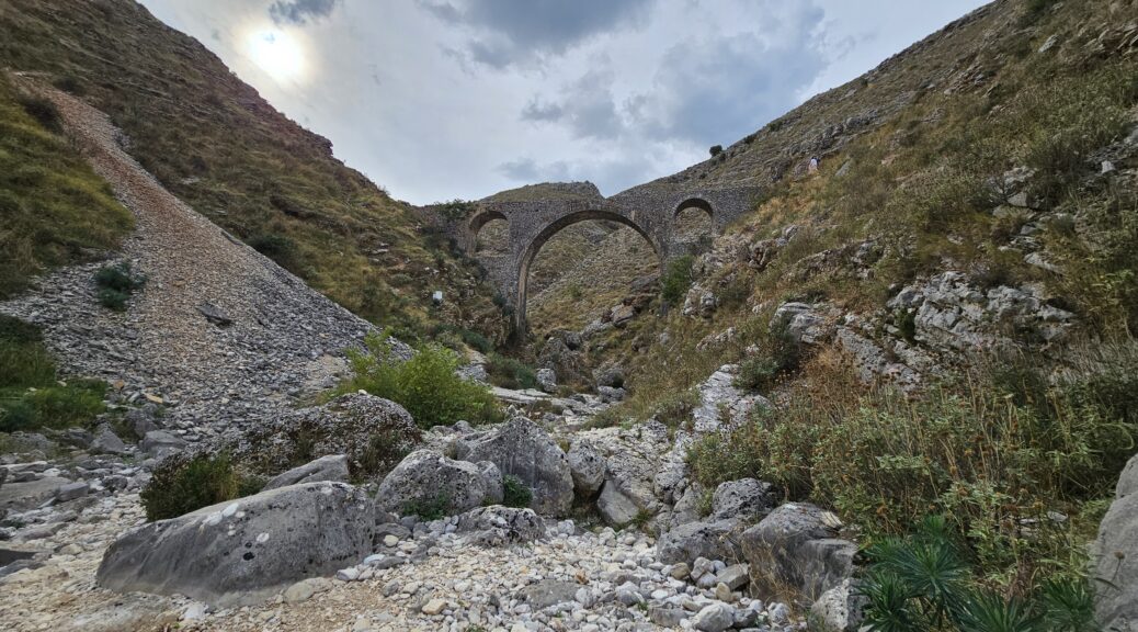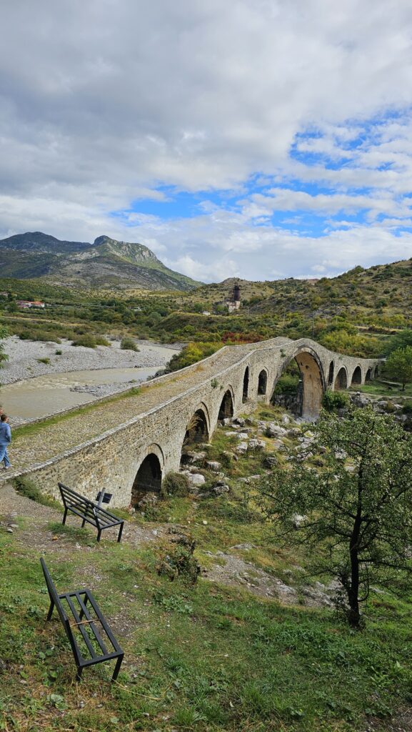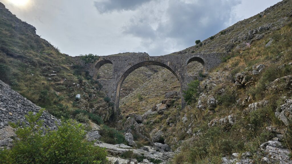 Wir wandern zur Ali-Pasha-Brücke, einer alten Steinbogenbrücke außerhalb der Stadt. Der Weg führt uns durch Olivenhaine, vorbei an kleinen Bauernhöfen und über staubige Pfade.