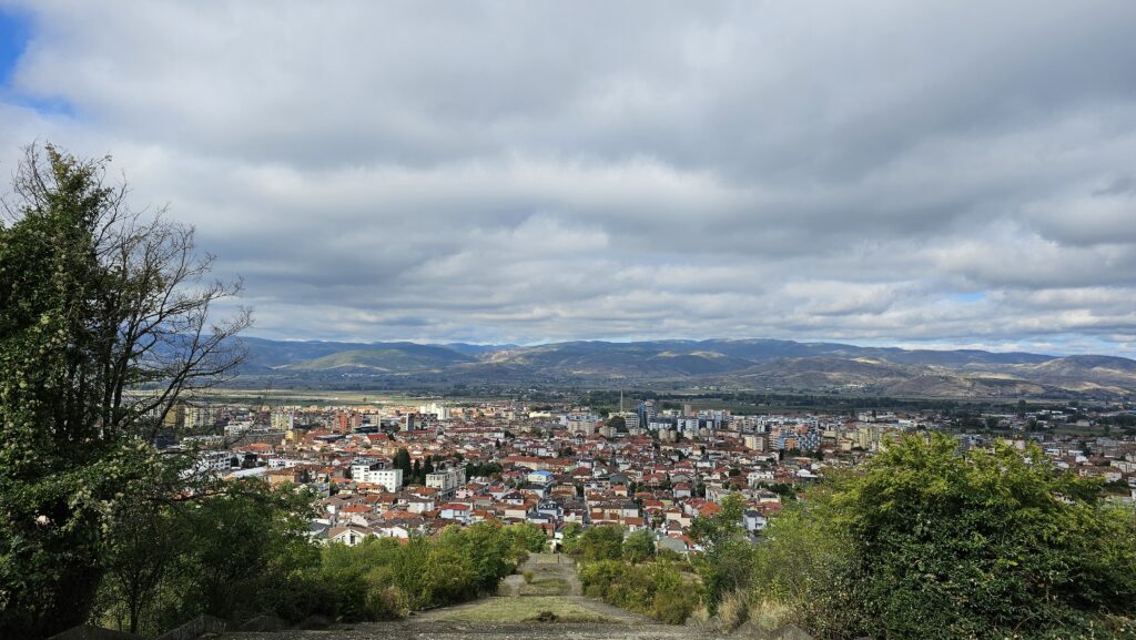 Von hier oben sehen wir Korça aus einer anderen Perspektive: die roten Dächer, die Kirchtürme, die grünen Parks – alles wirkt geordnet und friedlich.